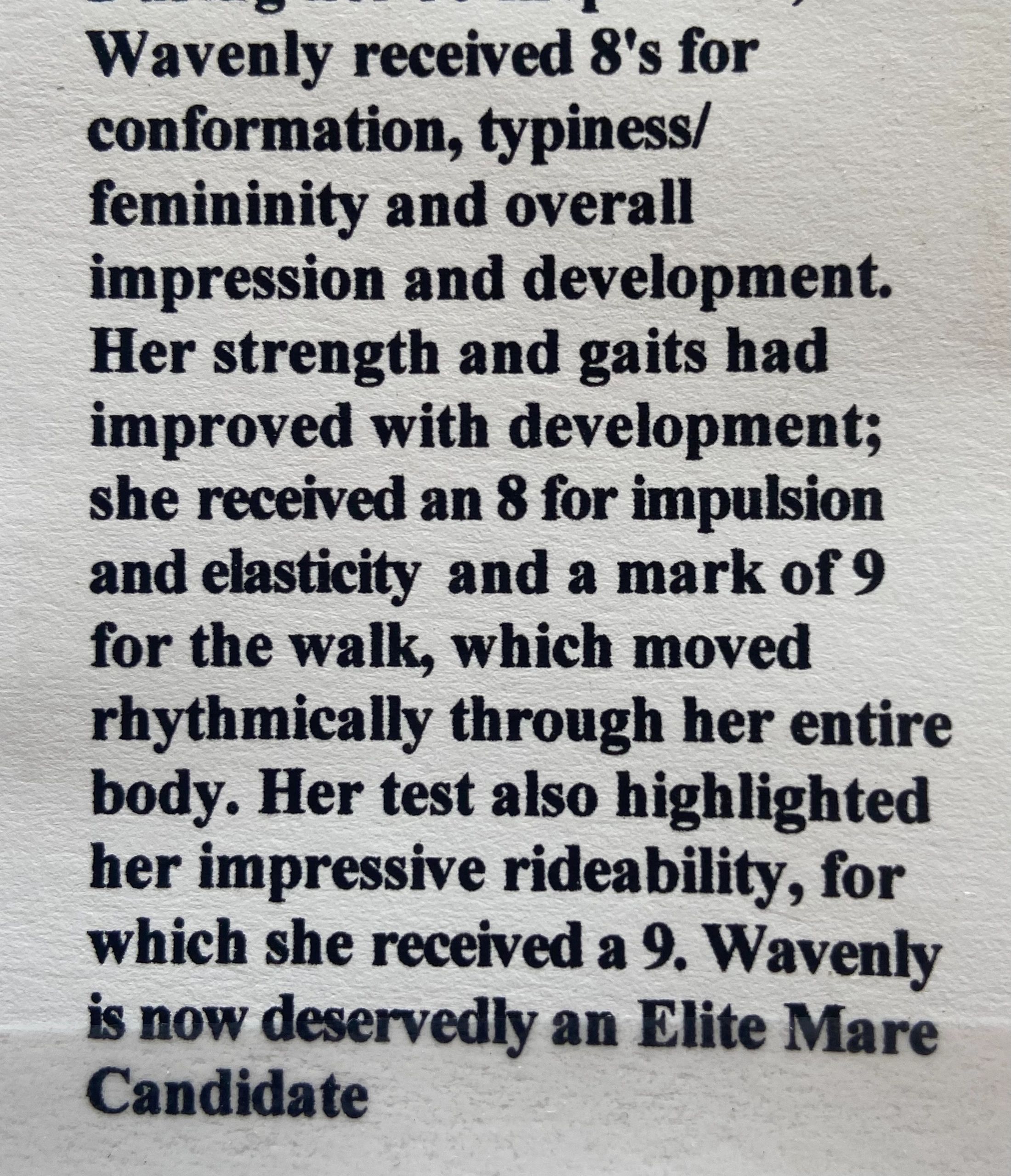 Wavenly won many breed show championships and Mature mare championships. She was winner of her Hanoverian inspection and Mare performance test. As a 3 year old she won many Material classes including a Second place at Dressage at Devon. As a 4 year old she was shown in the FEI 4 year classes and received the second highest score in the country that year with a 9 in Vermont!